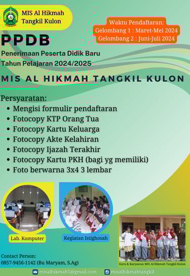 MIS Al Hikmah Tangkil Kulon, lembaga pendidikan Islam yang berkomitmen untuk mencetak generasi Qur'ani yang berakhlak mulia dan berprestasi, dengan bangga mengumumkan dibukanya pendaftaran peserta didik baru untuk Tahun Pelajaran 2024/2025.
