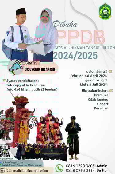 MTs Al Hikmah Tangkil Kulon dengan penuh kebanggaan mengumumkan penyelenggaraan Penerimaan Peserta Didik Baru (PPDB) untuk Tahun Pelajaran 2024/2025.