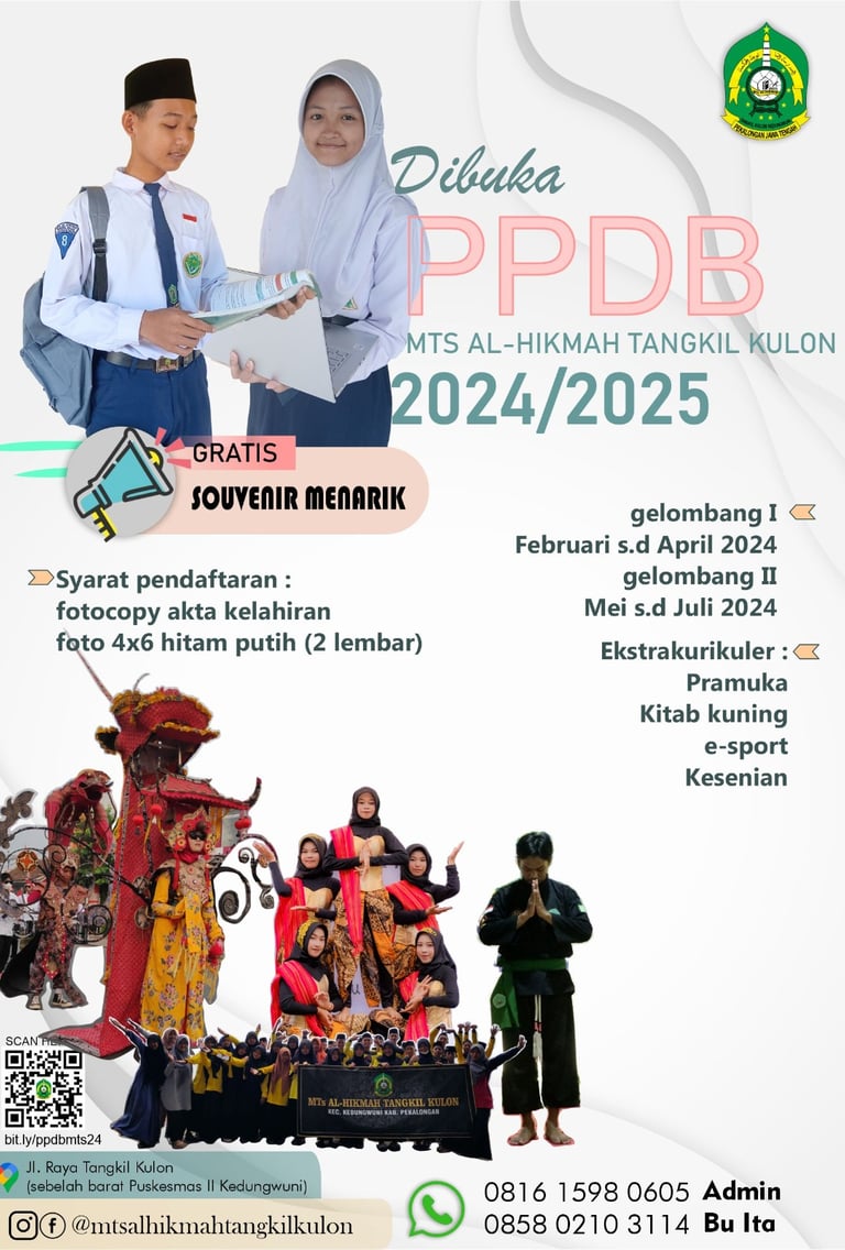 MTs Al Hikmah Tangkil Kulon dengan penuh kebanggaan mengumumkan penyelenggaraan Penerimaan Peserta Didik Baru (PPDB) untuk Tahun Pelajaran 2024/2025. Sekolah Islam yang unggul dalam bidang akademik dan non-akademik ini, mengajak para calon peserta didik yang memiliki prestasi gemilang dan akhlak mulia untuk bergabung dalam wahana belajar yang kondusif. Pendaftaran dapat dilakukan secara online melalui kanal PPDB online di http://bit.ly/ppdbmtsalhikmah24 atau diperoleh secara langsung di sekretariat sekolah MTS Al Hikmah Tangkil Kulon (https://maps.app.goo.gl/QXL3MQ2XKVUsvvUm6).