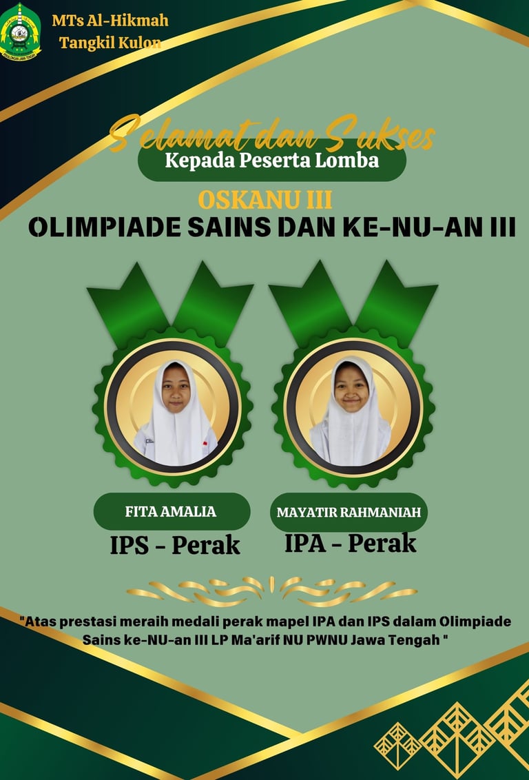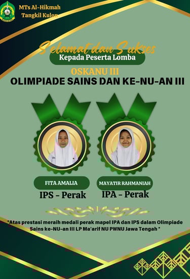 Madrasah Tsanawiyah (MTs) Al-Hikmah Tangkil Kulon kembali mencatat prestasi membanggakan dengan meraih dua medali perak dalam ajang Olimpiade Sains dan Ke-NU-an (OSKANU) III.